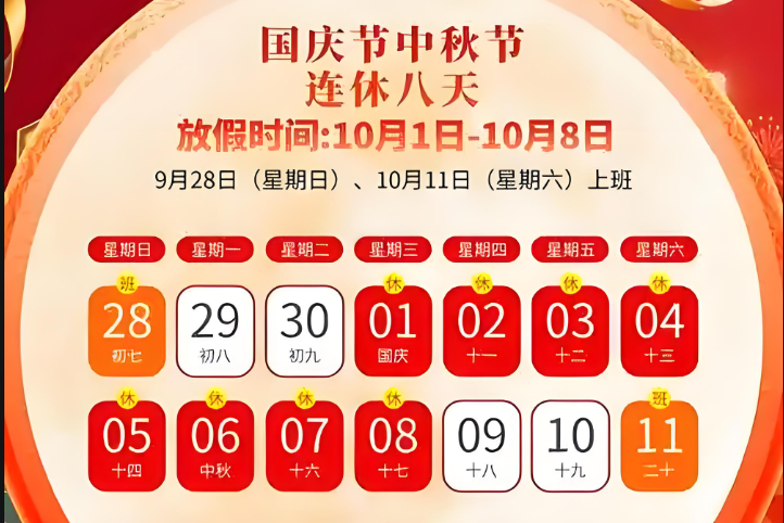 國慶節(jié)放假安排:10月1日(周三)至8日(周三)放假調休,共8天。9月28日(周日)、10月11日(周六)上班。